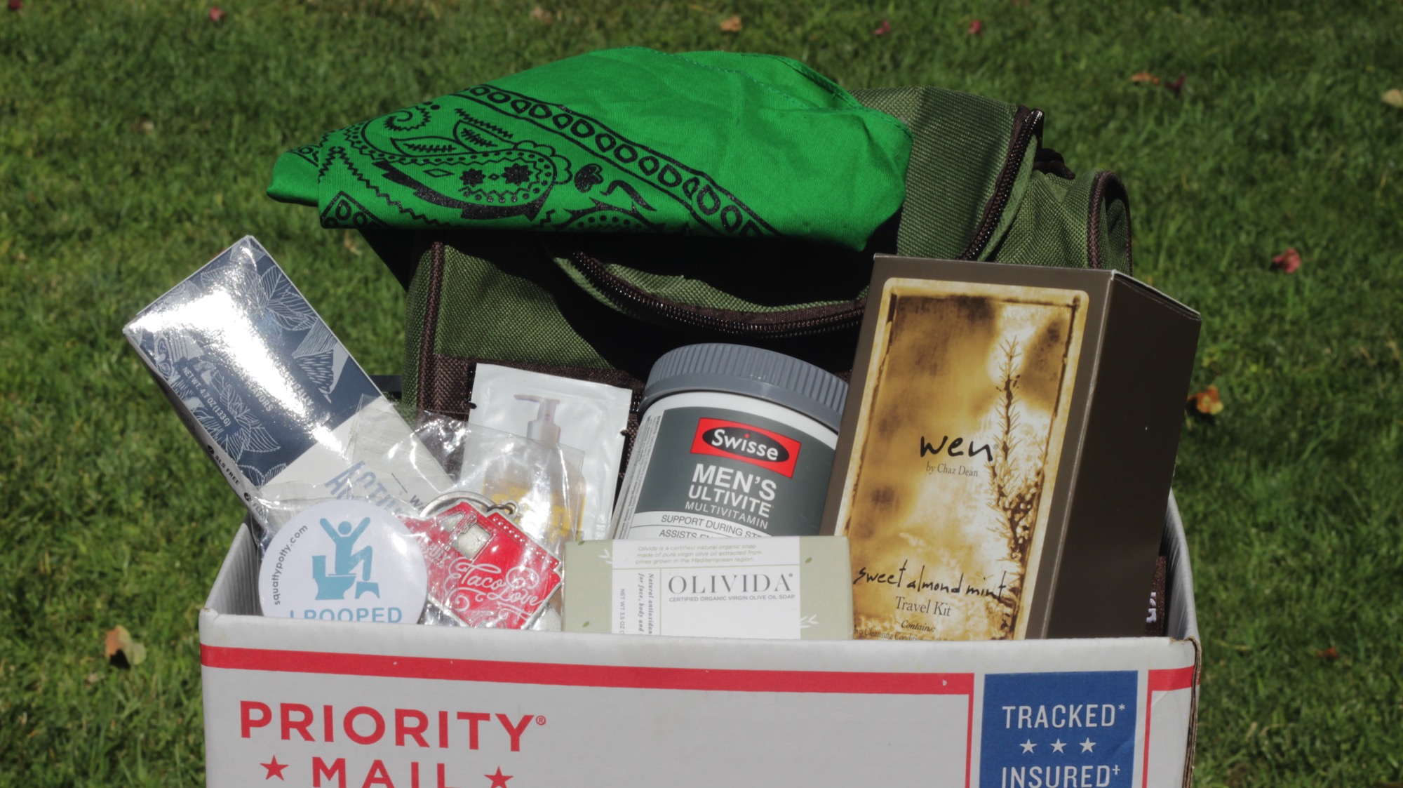 Box filled with hand-picked items, such as packaged food, accessories, clothing, home goods, body care, coupons and/or a book. Every box is one-of-a-kind!