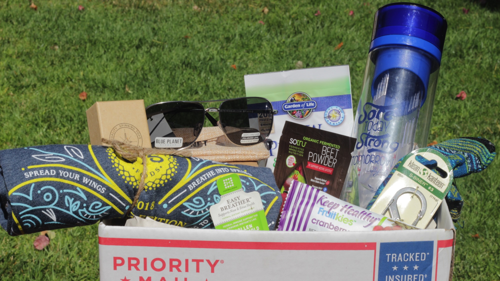 Box filled with hand-picked items, such as packaged food, accessories, clothing, home goods, body care, coupons and/or a book. Every box is one-of-a-kind!