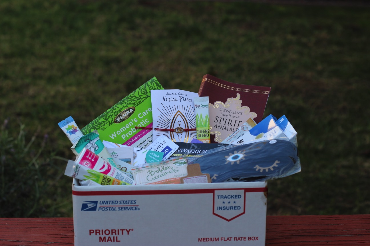 Box filled with hand-picked items, such as packaged food, accessories, clothing, home goods, body care, coupons and/or a book. Every box is one-of-a-kind!